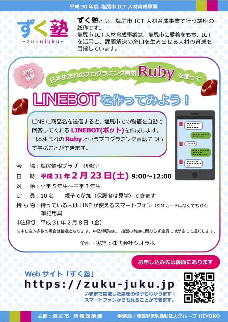 Rubyを使って「LINE BOTを作ってみよう!」を開催します 2019-02-03 LINEのキーワード応答メッセージ機能と、プログラミング言語Rubyを使って、塩尻市の物価を教えてくれるサービスを作ってみます。日時:平成31年2月23日(土曜日)9時〜12時場所:塩尻情報プラザ対象:小学5年〜中学3年ぜひご参加ください! ← お知らせに戻る